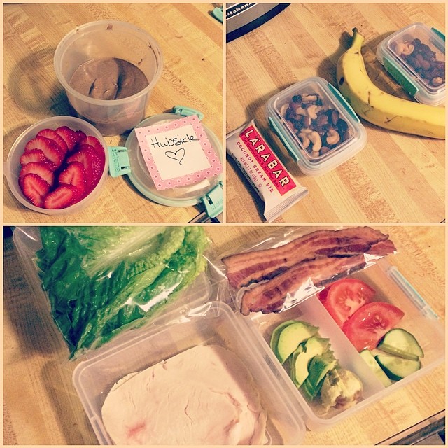 My current bento box masterpiece – 3 slices of turkey, 1 slice cheddar, grapes, and strawberries, with carrots and hummus (not pictured) to snack on later.